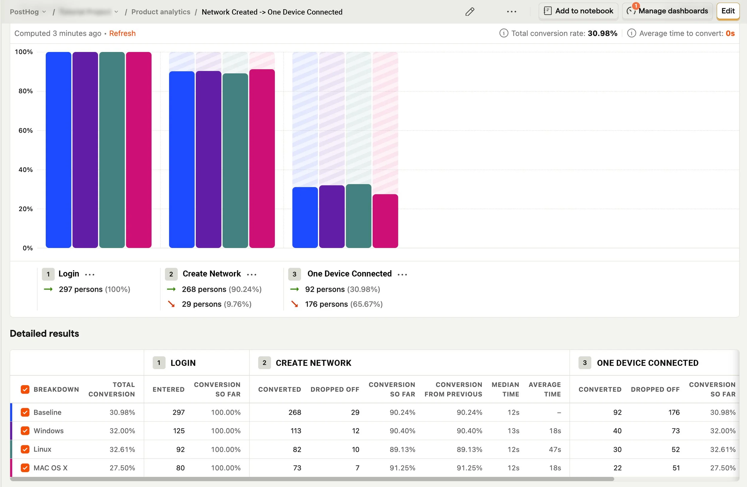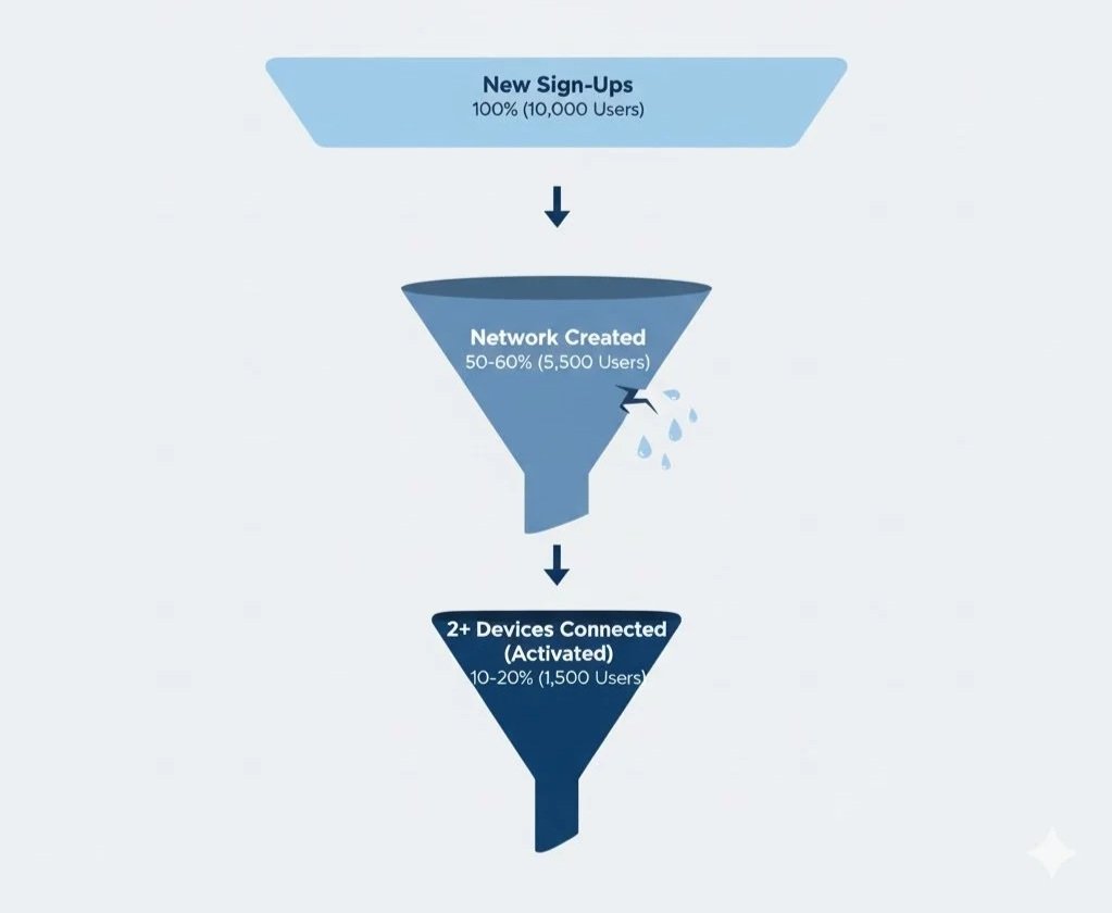 I studied our PostHog analytics funnels to understand behavior and engagement. The first obvious insight was how poor our onboarding conversion was — only ~10-20% were successfully connecting two or more devices to their networks.